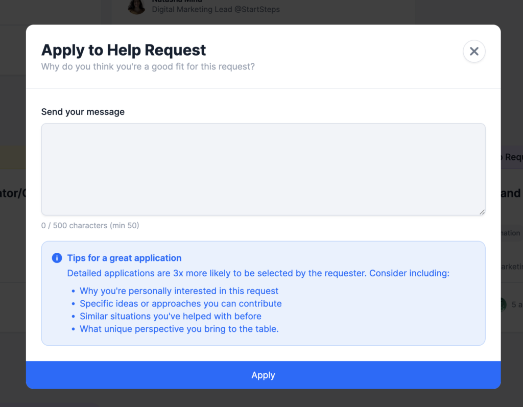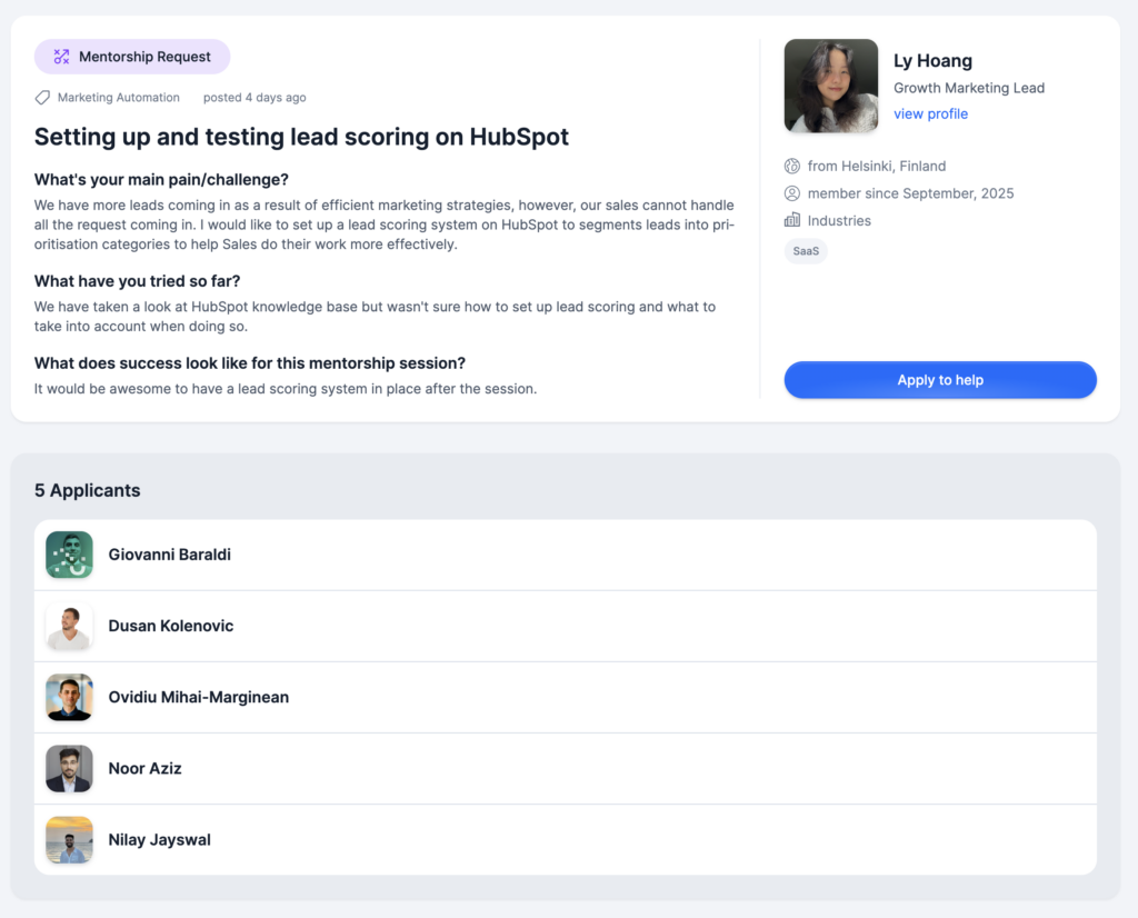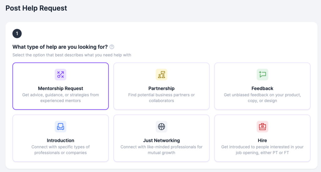 Help Requests extends our philosophy beyond traditional mentorship into six types of purposeful professional connections: